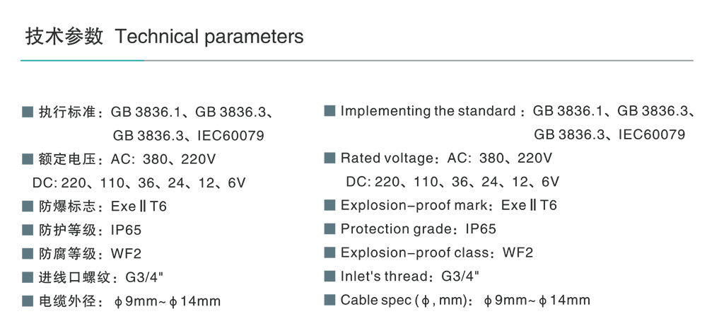 适用于1区、2区危险场所。 适用于ⅡA、ⅡB、ⅡC类,温度组别为T1~T6的爆炸性气体环境。