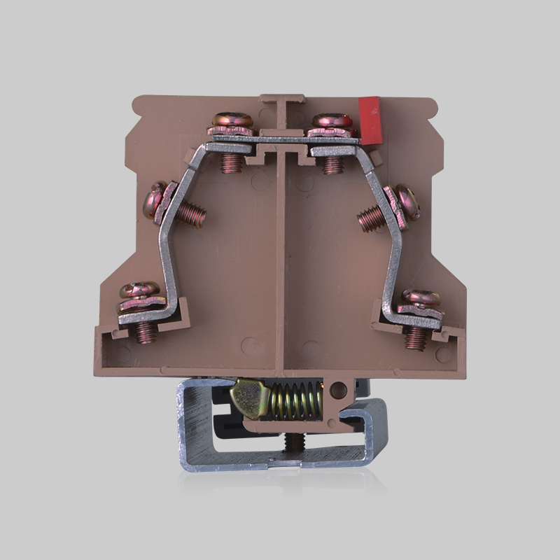 绝缘件采用阻燃聚碳酸酯或PBT,结构件采用板式导电片组合螺钉压接。额定电压交流500V,G型导轨安装,适用于0.75—50mm² 的导线连接。结构合理、安装可靠、使用范围广泛。